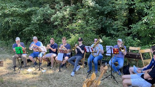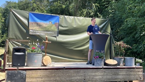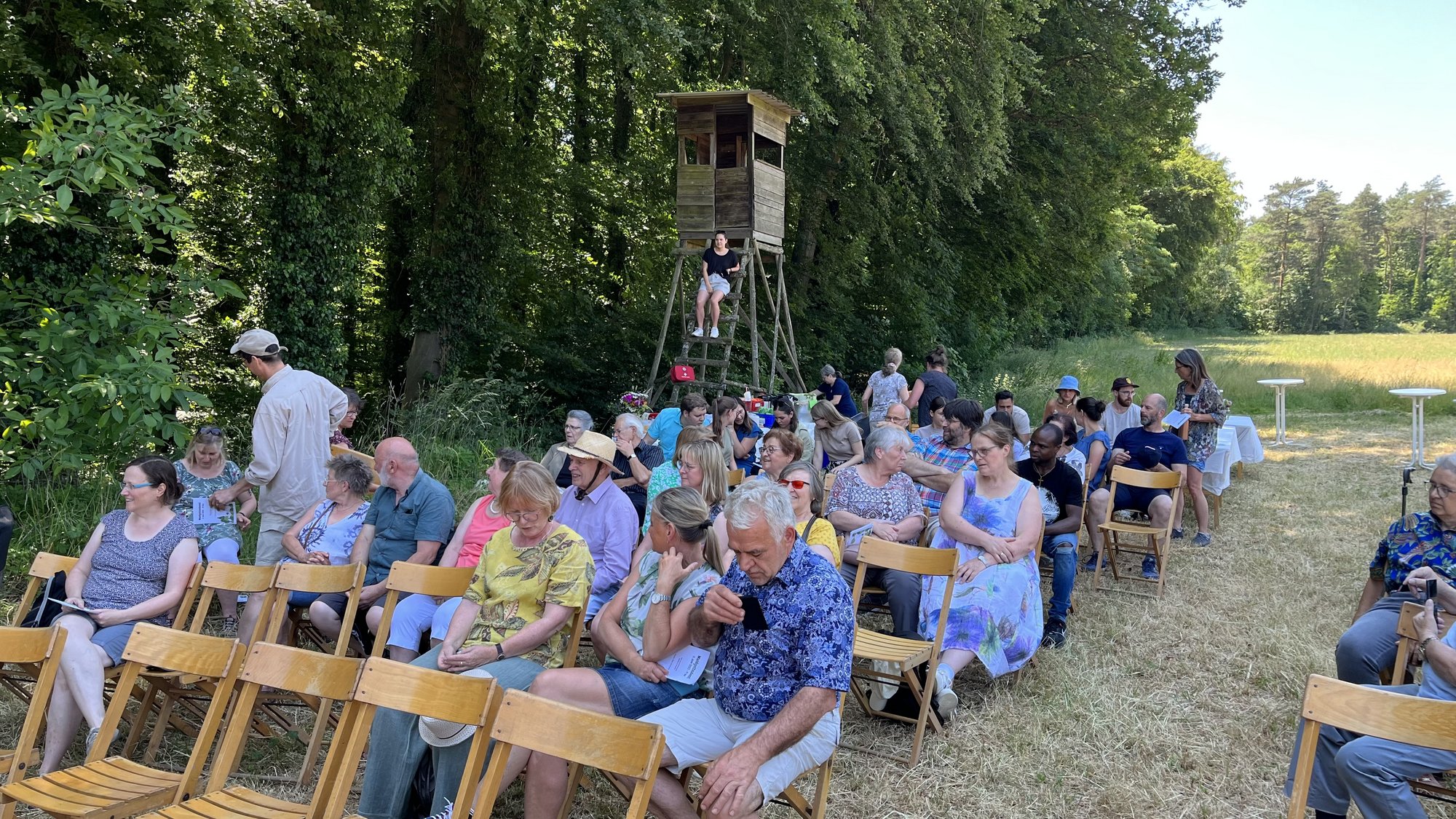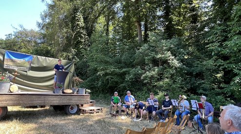 Vögel zwitschern, der Wind rauscht in den Bäumen, Kinderlachen und Schafe blöken. Da hinein setzen Trompetenklänge ein und der Waldgottesdienst im Gewann Platten beginnt. Die Bühne ist ein zünftiger Traktoranhänger, liebevoll mit Blumendeko und einem Holzkreuz dekoriert. Die Gottesdienstbesucher sitzen bequem auf Holzklappstühlen am schattigen Waldrand und werden herzlich willkommen geheißen.